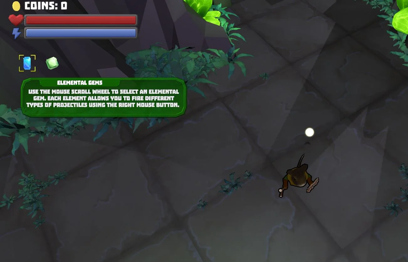 After the Player defeats the boss and collects the Earth Gem, another narrative plays out to guide the player’s attention to the UI elements of the newly added gems, instructing the Player on how to choose between them using the Mouse Scroll Wheel. The Player has a moment to test this if they choose to before the magic barrier disappears allowing the Player to proceed to the end of the level.