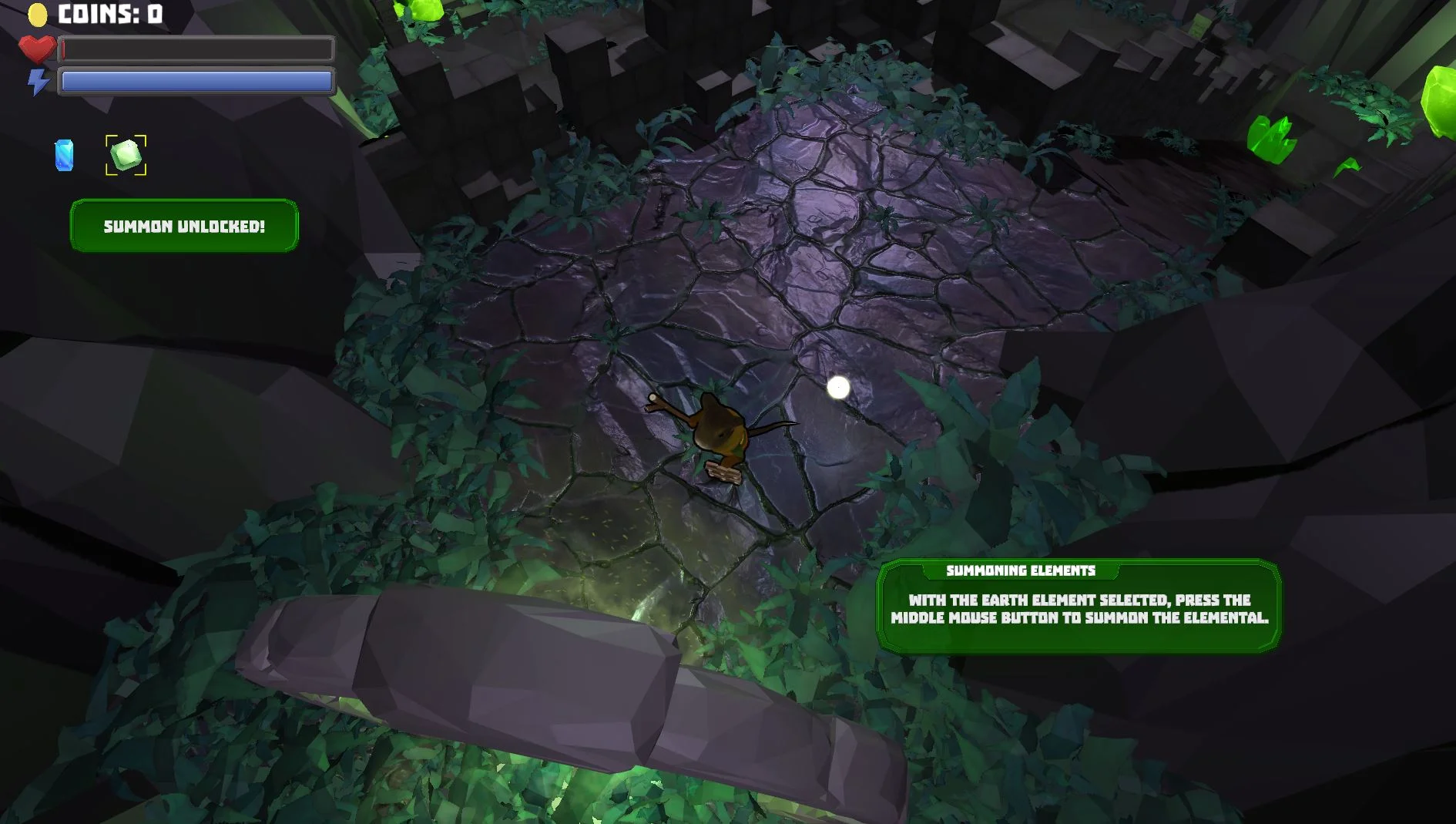 We also decided as a team that this “Earth Dungeon” level will be the next level the Player will enter after the Tutorial level. This meant that we had to incorporate a brief setup/tutorial that instructs the Player how to Summon elements and use their Alternate Attack/Projectile ability. I found a nice way to blend this in with the narrative so the Player felt a sense of progression, as well as to feel like they weren’t being led with so much hand-holding throughout the game.